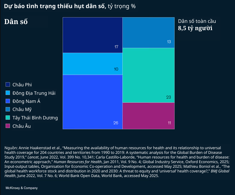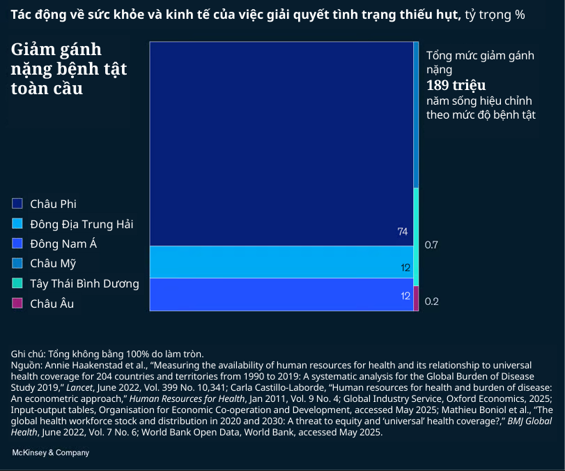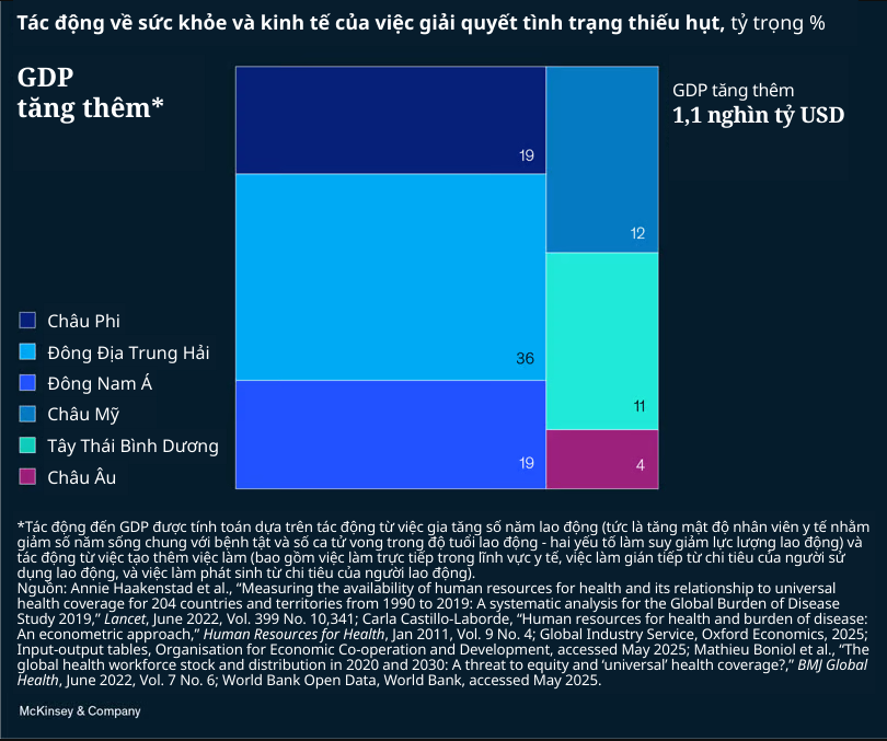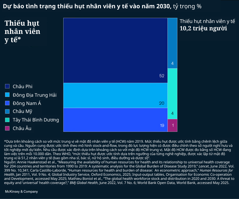 Dù làn sóng đầu tiên đã khiến Hoa Kỳ tụt lại về năng suất lao động trong ngành y tế—cũng như một số lĩnh vực khác—quốc gia này không đơn độc trước thách thức về nhân lực. Trên toàn cầu, tình trạng thiếu hụt nhân viên y tế được dự báo sẽ lên tới 10 triệu người vào năm 2030. Thu hẹp khoảng cách nhân lực trong lĩnh vực này có thể mang lại <yield> lợi ích đáng kể, với tiềm năng giúp giảm 7% gánh nặng <burden> bệnh tật và đóng góp thêm 1,1 nghìn tỷ <trillion> USD cho kinh tế toàn cầu.